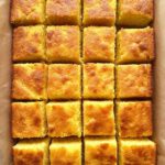 - Serve: Run a knife around the edges to loosen the bars. Lift the entire slab out using the parchment paper overhang and transfer it to a cutting board. Cut into 24 square pieces. Optionally, sprinkle additional powdered sugar on top before serving.