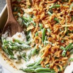 This Green Bean Casserole recipe features tender blanched green beans enveloped in a creamy, flavorful sauce made with butter, flour, spices, Dijon mustard, chicken stock, and half and half. Topped with crispy French fried onions and baked until bubbly and golden, this classic dish makes a comforting and delicious side perfect for holiday meals or family dinners.